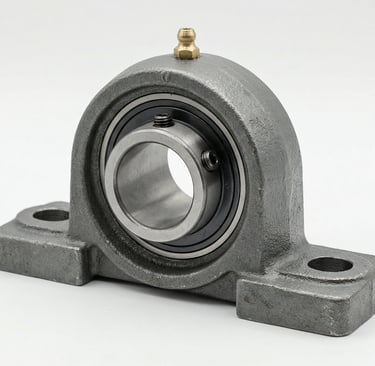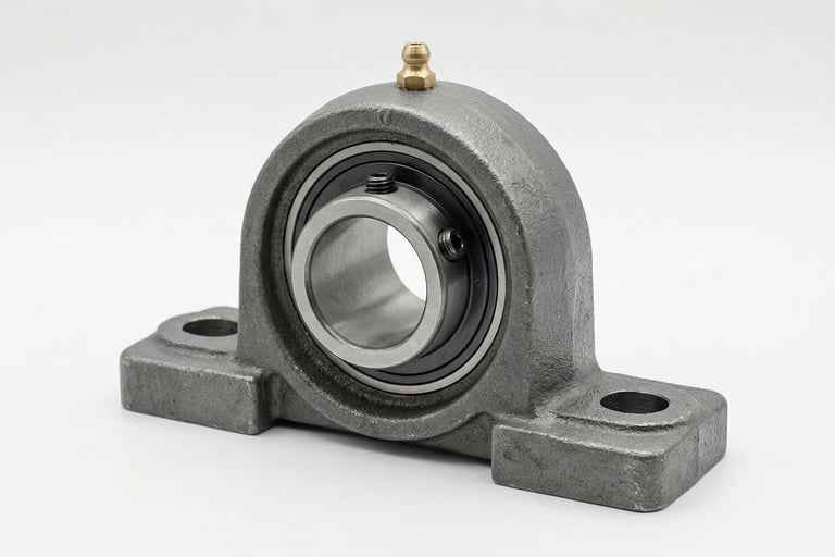 The most common mounted bearing. Base-mount housing with a set-screw or adapter-sleeve insert bearing. Used on conveyor systems, fans, agricultural equipment, material handling, and general industrial machinery. Available in standard and heavy-duty cast iron housings.